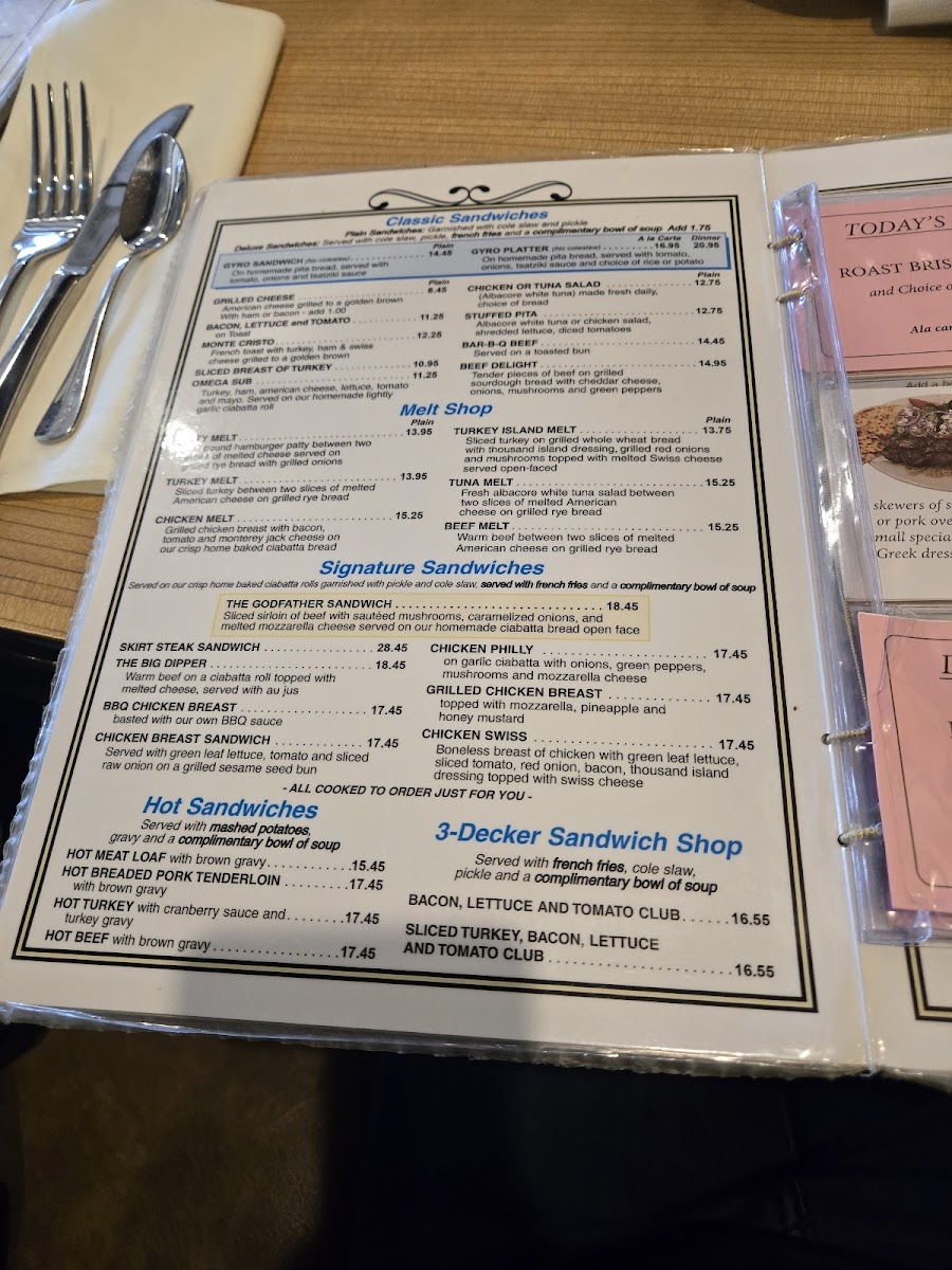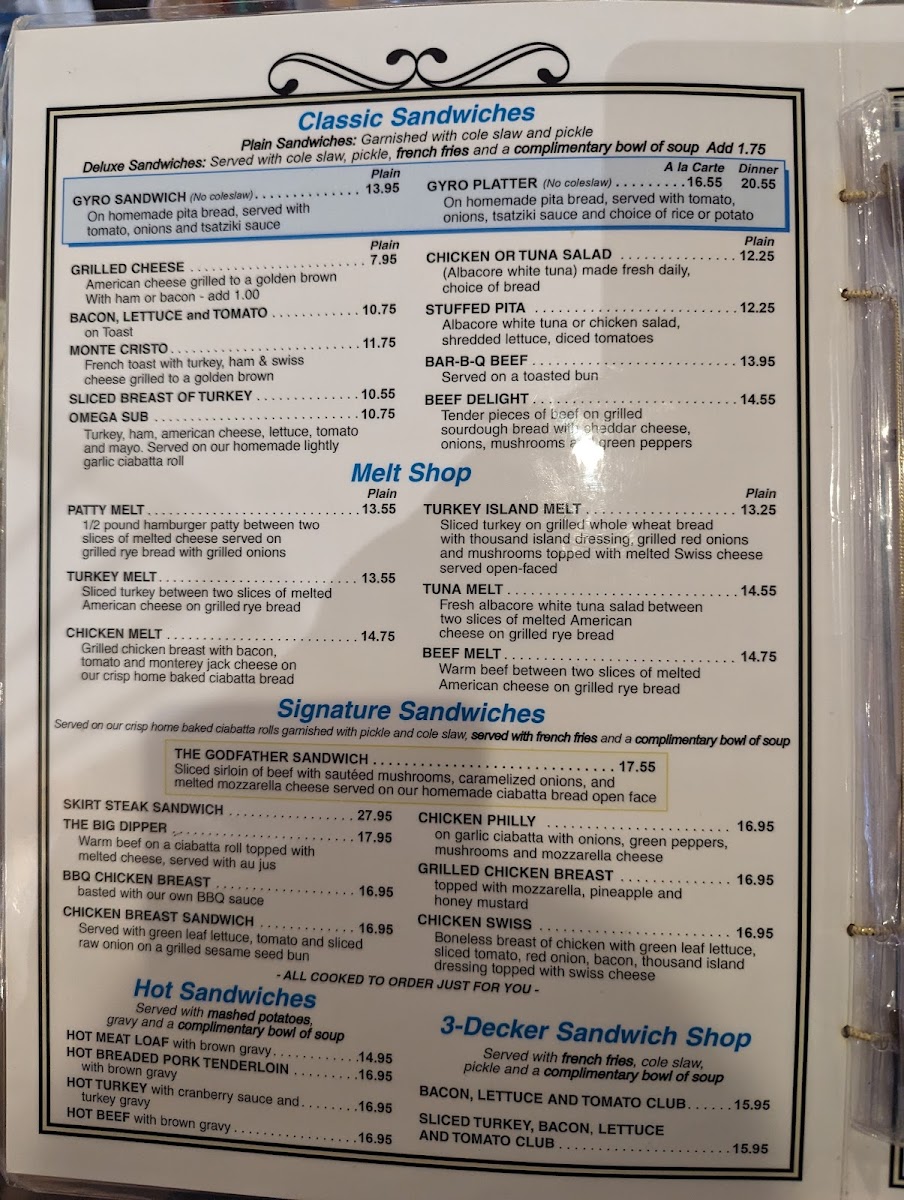 “ Had lunch at Omega. Ordered wings, soup, bread basket, BBQ Burger and Turkey BLT Decker sandwich and two drinks. Came out to $60.00 Typical family restaurant, good food for a good price. A little dated and older crowd attendance, but typical for family restaurants. Create variety of desserts from their bakery/dessert counter. Definitely enjoyed our meal here. ”